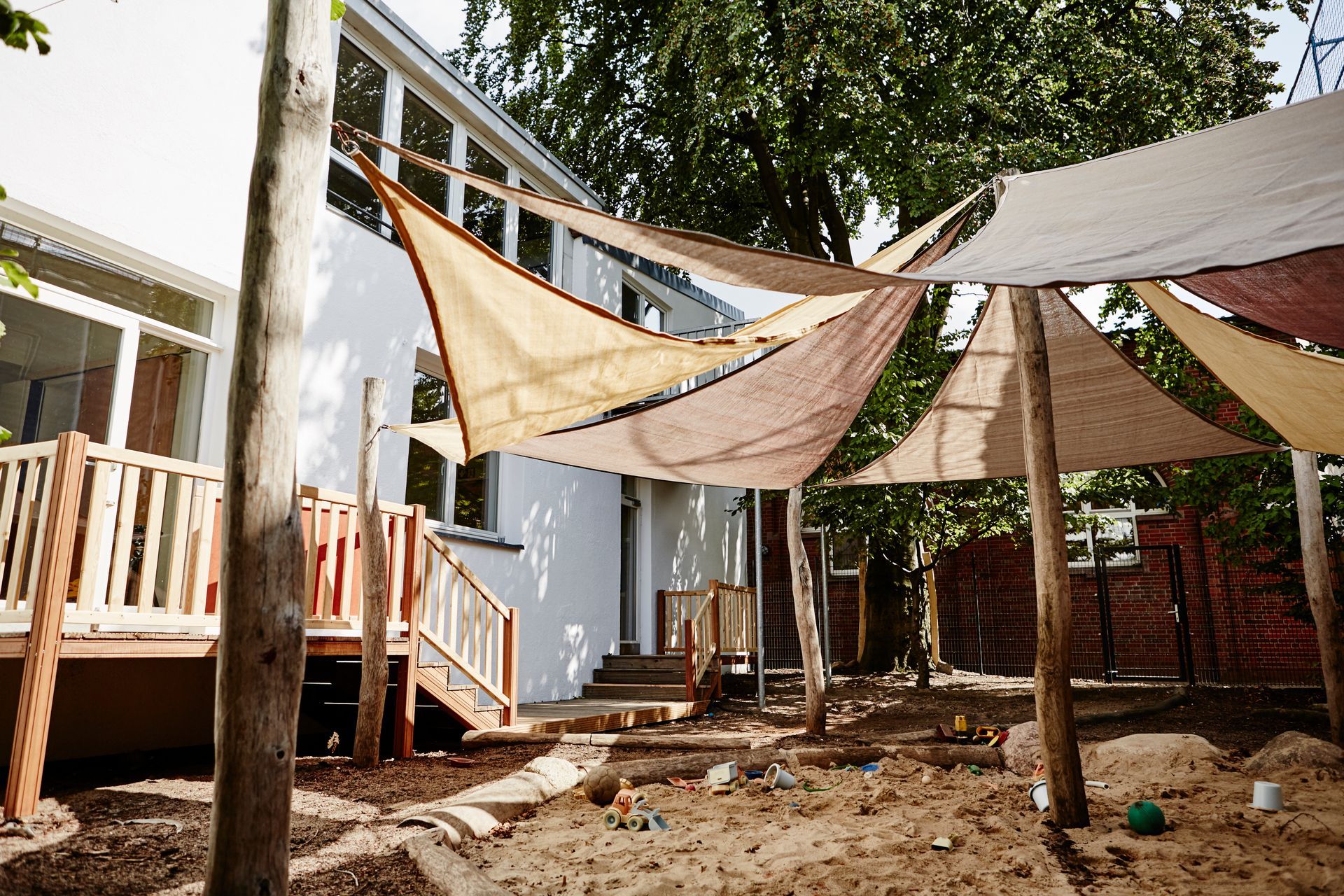 Außerdem haben wir ein eigenes Außengelände mit einem Sandkasten zum Buddeln und Matschen, und die Möglichkeiten zu klettern und zu balancieren. In einem zusätzlichen Außenbereich mit kleinen Blumen- und Gemüsebeeten können Pflanzen angebaut und Insekten beobachtet werden. Eine Bank und andere Sitzmöglichkeiten, laden zum Verweilen ein und um sich vielleicht ein Buch mit der Bezugserzieherin anzuschauen.